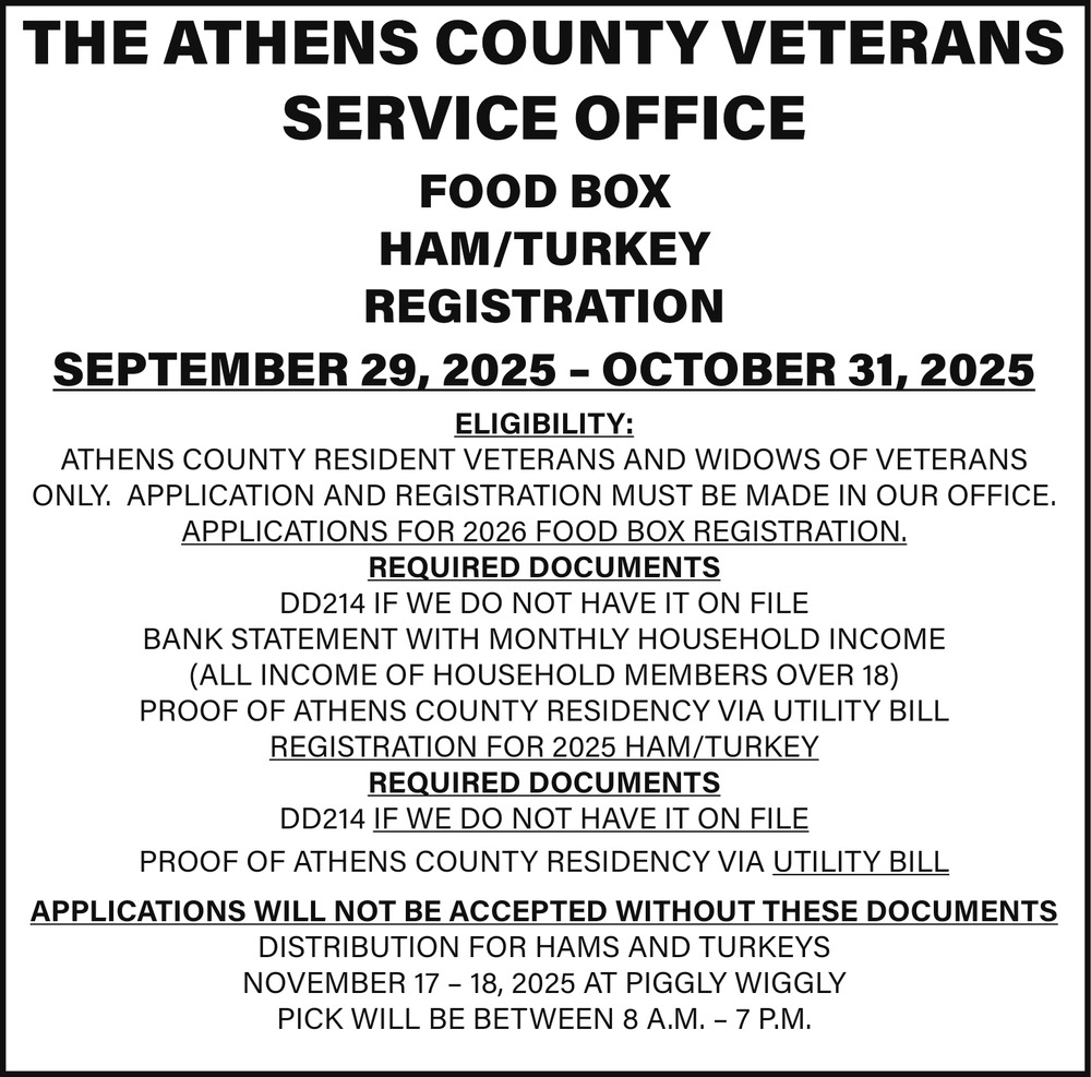 Oct 02, 2025. Athens County Veterans Services Office Associations & Organizations Ads from The Athens Messenger