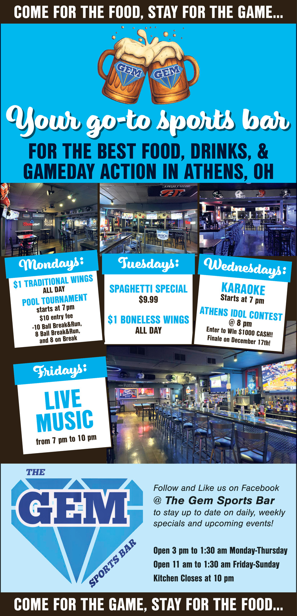 Nov 29, 2025. The Gem Sport Bar Bars & Clubs Ads from The Athens Messenger