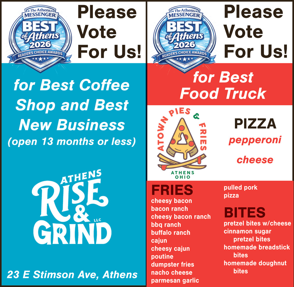 Apr 09, 2026. Athens Rise & Grind - Atown Pies & Fries Restaurants Ads from The Athens Messenger